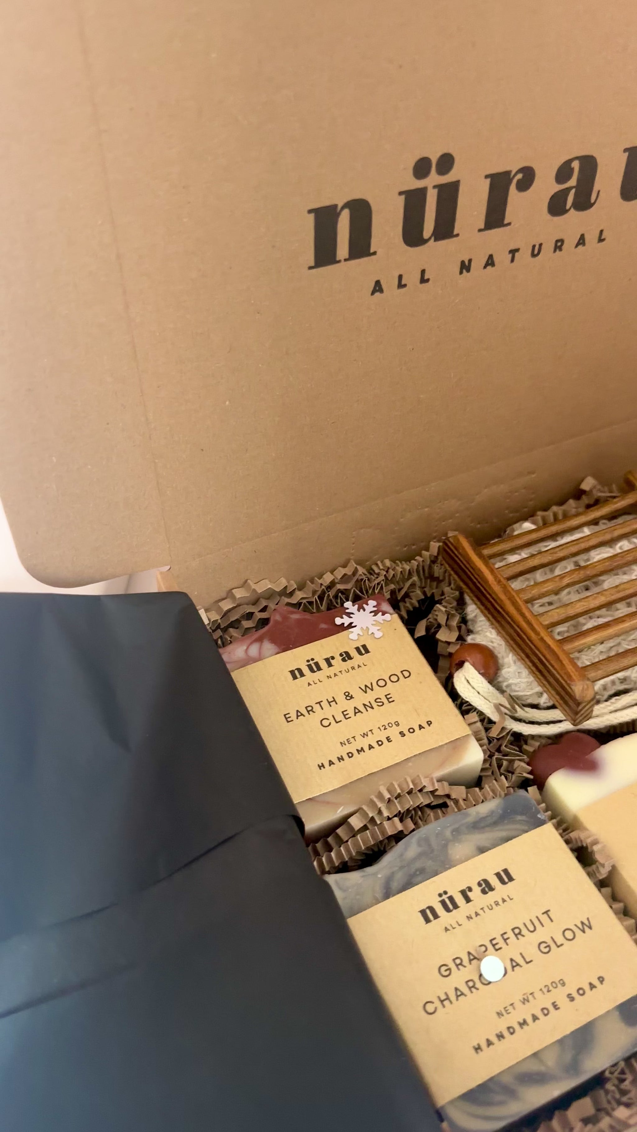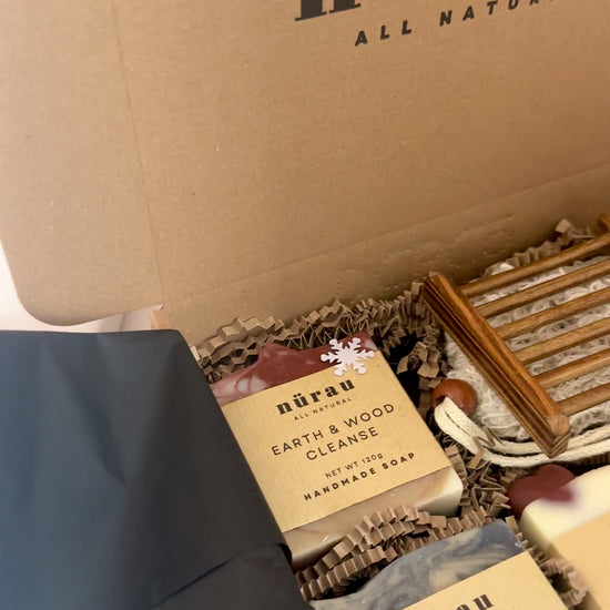 To enhance your bathing ritual, the gift box includes a bamboo soap dish and a soap saver bag, ensuring longevity and a luxurious lather. Elegantly packaged with tissue and shredded paper, this set makes for a thoughtful and eco-friendly Christmas present.